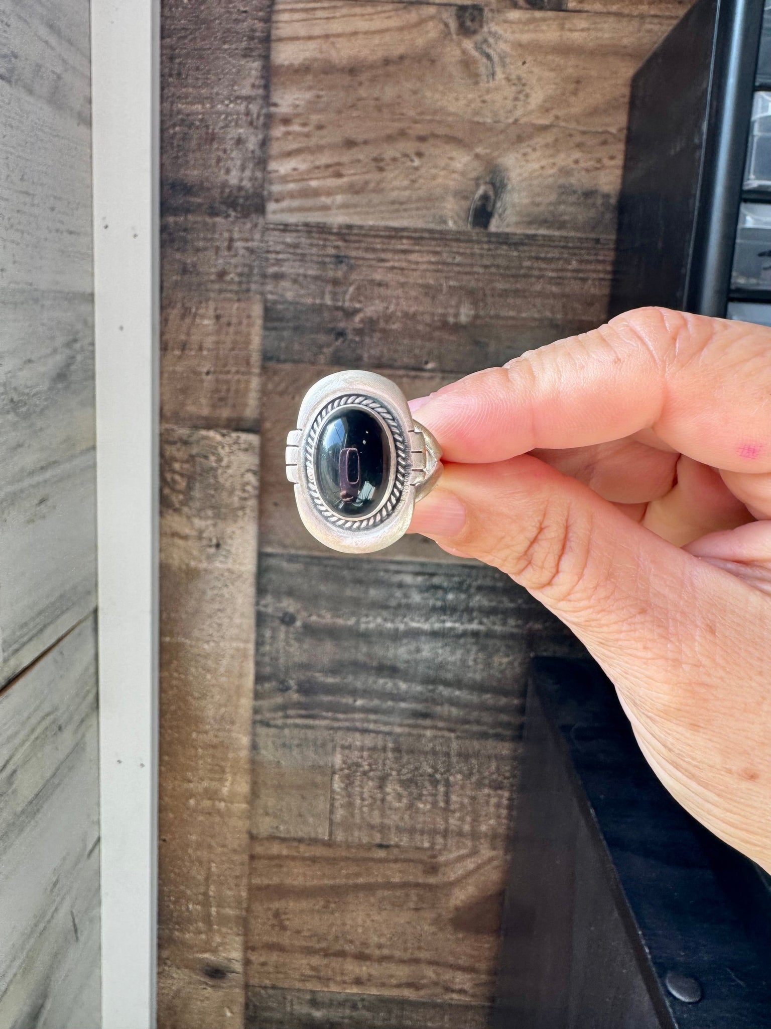 Classic and bold, this sterling silver ring features a smooth oval-cut black onyx stone. Available in size 7.5 and 8, it's perfect for everyday wear or stacking with your favorite rings. The sleek, simple setting makes the stone stand out beautifully.